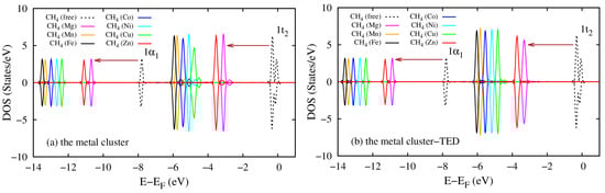 DOS of the adsorbed CH4 molecule on M(DABCO) compared to that of the free CH4 molecule: (a) on adsorption site 1 (the M-O-C cluster) and (b) on adsorption site 2 (the interace between the M-O-C cluster and TED).