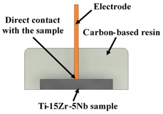 For electrochemical measurements, the samples were cut and embedded in carbon-based resin to protect the edges during grinding and polishing. Afterward, a copper wire was attached to the sample as presented in Figure 1 to assure electrical contact between the working electrode and the potentiostat during the electrochemical measurements.