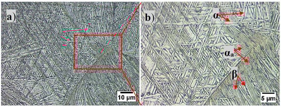 The microstructure of the investigated alloy after metallographic preparation is presented in Figure 3. The material consists of α and β phases which is in agreement with the XRD analysis. The etchant colors the β phase dark brown while the α phase resembles a shade of light gray. Since there is a potential difference between the phases, the differences alter the rate of attack and reveal the microstructure when chemical etchants are used. In a two-phase alloy, the potential of one phase is greater than that of the other. During etching, the more electropositive (anodic) phase is attacked (the β phase), while the more electronegative (cathodic) phase is not significantly attacked (the α phase) []. The α phase presents two types of morphologies as presented in Figure 3b. Thus, the identified α phases within the microstructure are namely: lamellar α phase (α) which predominates the microstructure, and a secondary acicular phase (αa). In addition, the α phase nucleates during cooling and is encountered at grain boundaries. Generally, the β phase presents a lamellar microstructure in which the α is embedded. The lamellar microstructure is attributed to the solidification process which is responsible for the shape and size of the lamellas as well as for the formation of α grain boundaries. The parallel α lamellas within a colony indicate a deformation in a similar way formed from the same β parent grain. In addition, the α and β phases no other phases nor precipitates were identified by using metallographic characterization. In comparison with the findings reported by Moreno et al. when studying the microstructure and electrochemical behavior of Ti-15Zr-5Nb alloy obtained by vacuum melting [], besides the lamellar microstructure in our study acicular α was identified as well at some grains next to the grain boundaries. The acicular morphology is attributed to the martensitic transformation which depends only on the cooling rate [].