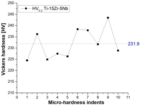 The microhardness test was carried out using a load of 200 gf and the results are summarized under graph form in Figure 5. It can be seen that the average HV value was 231.9 ± 6.28 which is bigger than the microhardness of Ti-CP which is 210 HV tested under the same conditions []. The fluctuations in the measurements are caused do the differences of hard and soft regions ascribed to the α and β phases identified within the microstructure [].