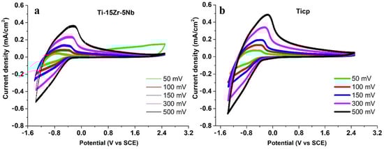 CVs were performed on Ti-15Zr-5nb and Ti-CP at different potential sweep rates in the range of 50 mV/s up to 500 mV/s between −1.5 V and 2.5 V vs SCE to determine the potential ranges of different electrochemical reactions of the samples in HCl electrolyte and the results are presented in Figure 6. Moreover, their kinetic features were assessed to determine the most appropriate conditions for the potentiostatic study of corrosion reactions. Figure 6 presents the CVs of Ti-15Zr-5Nb and it can be observed that the potential rises above 2.2 V vs. SCE at a sweep rate of 50 mV/s, the current increases abruptly to an elevated value indicating the deterioration of the passive film and the initiation of pitting corrosion of the samples. Thus, this potential is equivalent to the transpassivation potential threshold. The anodic current increased steadily as the potential sweep rates increased, making the passive film stronger against damage due to the increase in film thickness while no film breakdown was noticed. Similar circumstances were observed for the Ti-CP sample at all potential sweep rates, with a current plateau extended to the end of the potential values. As the potential ascends from −1.5 V vs. SCE, the anodic current increases for both samples, with anodic peaks that eventually merge into one, a higher and larger peak as the potential sweep rate increases. These anodic peaks are related to the following Ti oxidation reaction as presented by Pourbaix []: