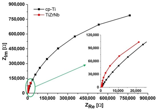 The electrochemical behavior of Ti-15Zr-5Nb and Ti-CP was investigated using CV and EIS using a Biologic SP-150 potentiostat (BioLogic Science Instruments, Seyssinet-Pariset, France). The electrochemical experiments were conducted at a temperature of around 22 °C, by using a standard electrochemical glass cell containing 350 mL of HCl solution with a pH of 2.5. Even though the normal acidity of the oral cavity is higher, a low pH was chosen for the study because it is of interest to analyze the behavior of the alloy in extremely severe conditions. Moreover, most carbonated drinks have this pH. The fresh drinks are taken between 5 and 8 °C and the temperature of the oral cavity decreases, remaining for a certain time at much lower values than the normal body temperature. The working electrode’s potential was determined relative to a saturated calomel electrode (SCE) immersed in potassium chloride (KCl) solution. Platinum gauze served as the counter electrode. Before testing, each electrode was maintained at −1.5V for 15 min to reduce any oxides developed on the surface of tested samples. The CV was assessed at a potential in the range of −1.5V to 2.5V vs SCE with a potential step rate of 10, 50, 100 and 200 mV/s. The recorded EIS data were fitted with an equivalent circuit by using the Lavenberg–Marquardt methods and ZView 2 software (Scribner Associates, Inc., Southern Pines, NC, USA).