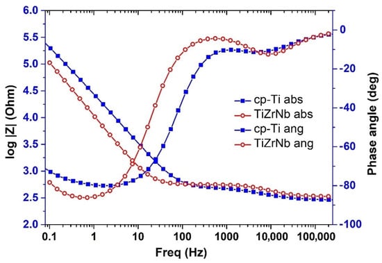 Bode diagrams of Ti-CP and Ti-15Zr-5Nb tested in HCl.