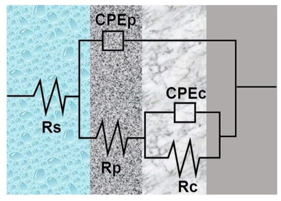 After analyzing the profiles of the impedance spectra, the experimental data were translated to an analogous electrical model. An analogous circuit is a collection of passive components (resistance, inductors, capacitances and other types of distributed impedances) that demonstrate corrosion-like behavior in the frequency range under consideration. The constant phase element (CPE) introduced by Boukamp [] leads to better results. Thus, it is an adjustable element in electrical equivalent circuits that can detect a broad spectrum of electrochemical behavior in impedance spectroscopy, particularly those including non-ideal capacitive, inductive, and resistive characteristics. Its value labeled “n” allows for continuous phase angle adjustment leading to a more accurate illustration of complex electrochemical systems. The response of the real system is closer to the ideal one because the value of “n” is close to the unit and the surface is more uniform. As a result, for n = 0, the CPE element is a simple resistance, and for n = 1, it is a capacitor with capacitance Y0. In the present work, the circuit presented in Figure 9 was used with the following elements to fit the EIS experimental data: