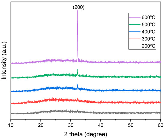 The structural characteristics were investigated using X-ray diffractograms. The X-ray plots of CeO2 thin films with various annealing temperatures are depicted in Figure 1. A distinct intense broad peak was observed at an angle of 32.28 along the (200) plane in all samples. The X-ray plot peaks closely match the cubic ceria of a fluorite structure, consistent with the JCPDS data 34-0394, with a strong preferred orientation along the (200) plane [19]. It is evident from the XRD spectrum that the intensity of the (200) peak increases with higher annealing temperatures, which may be attributed to the relaxation of the structure induced by the heating treatment. The size of crystallites, dislocation density, and film microstrain were assessed to determine the effect of annealing temperature on lattice parameters.
