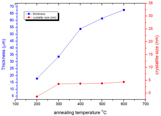 Figure 4 displays the thickness of the CeO2 thin films measured from SEM cross-sections at different annealing temperatures. As shown in Figure 4, the thickness of the films increased with higher annealing temperatures across all samples. This phenomenon can be attributed to the increased energy gained by the molecules due to the elevated annealing temperatures, as well as the enhancement of the potential force between the substrate and the films. This results in a reduction in porosity, as mentioned previously, and an increase in film thickness. The porosity of the films is inversely related to crystallite size as well as film thickness.