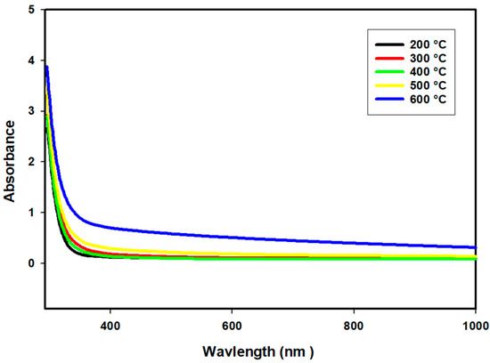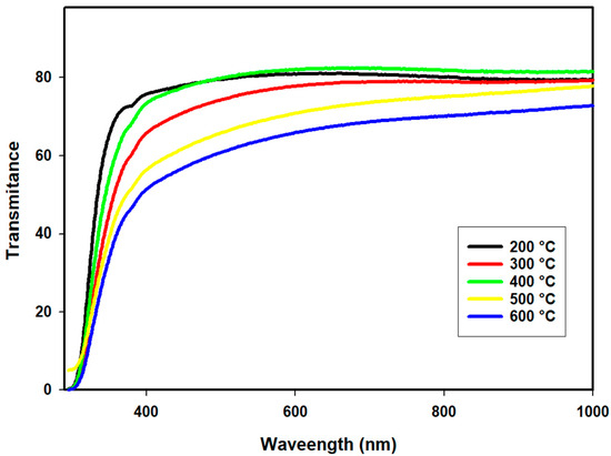 The optical band transition in the films offers vital details on the film’s electronic structure and helps in the construction of optoelectronic devices. The films’ transmittance, absorbance, and reflection spectra were obtained using UV–vis spectroscopy measured in room-temperature air. The wavelength dependence of the optical transmittance spectra for the CeO2 films annealed at different temperatures (200–600 ), within the wavelength range of 300–1000 nm, is depicted in Figure 5. It is clearly seen that all films are highly transparent in the visible and near-infrared regions, with transmittance values ranging between 60% and 80%, indicating uniformity and good adherence to the glass substrates. However, it is observed that the transmission of CeO2 decreased with increasing annealing temperatures due to certain physical effects, such as crystal orientation, low porosity, and an increase in the film thickness. Similar results have been reported by Elmas et al. for CdS thin films grown on glass substrates using a spray pyrolysis technique annealed at different annealing temperatures [21]. This finding is similar to that of CdS because the same dependencies of annealing temperature and transmittance have not been found for CeO2 thin films. The decrease in transmittance is crucial for certain applications, particularly optical devices that necessitate controlled light transmittance [22].