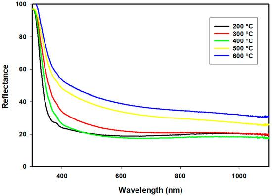 Reflectance measurement is key to understanding real absorption. Figure 7 displays the experimental reflectance spectra of CeO2 thin films at different annealing temperatures. As can be observed, reflectance is clearly dependent on the post-annealing temperature. A larger crystallite size leads to increased optical reflectance. Another study observed similar results for CeO2 thin films deposited by magnetron sputtering [23]. The increase in optical reflectance of the thin films with increasing film thickness can be attributed to light scattering within the film layers, resulting in reflections from the film surface.