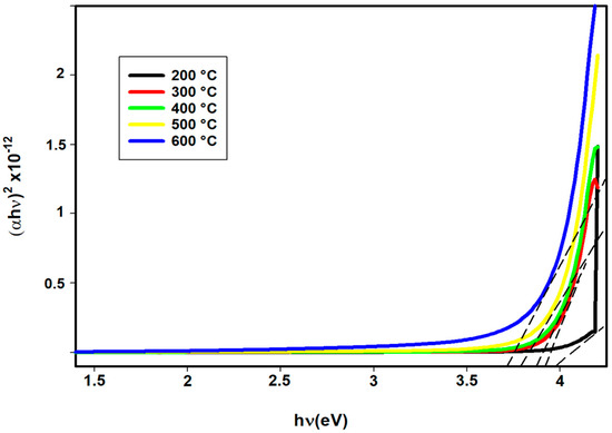 For direct transition, n = 1/2. Tauc plots of CeO2 films annealed at different annealing temperatures are shown in Figure 8. By extrapolating the linear portion at , the optical band gap energy of the films can be determined. It was found that, for all deposited films, an increase in annealing temperature led to a decrease in optical band gaps from 3.99 to 3.75 eV. Nunes et al. [24] observed a decrease in the band gap of TiO2–CeO2 multilayer thin films with increasing temperatures. The obtained values for the band gap Eg are in good agreement with the literature [9,23,25]. The reduction in the energy band gap can be attributed to the presence of oxygen ion vacancies, which act as positively charged centers occupied by electrons. These vacancies serve as donor centres, with their energy levels lying close to the valence band. Post-heating treatment modifies the energy gap by lowering the conduction band edge and correspondingly raising the valence band edge, akin to the Moss–Burstein shift observed in semiconductors [24,26]. Additionally, the narrowing of the film’s band gap may also result from the improvement in crystallinity with increasing annealing temperatures, as evidenced by the XRD results.