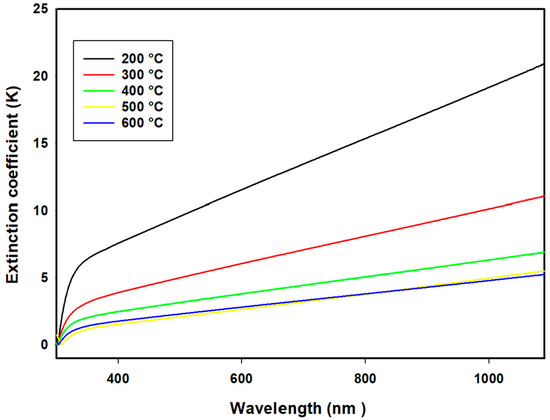 where is the wavelength of incoming light. The spectra of the extinction coefficient of the CeO2 thin films deposited at different annealing temperatures are shown in Figure 9. A continuous variation in the extinction coefficient is obtained with increasing annealing temperatures.
