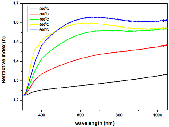 The refractive index rises in direct proportion to the increase in annealing temperature, as seen in Figure 10. Furthermore, data analysis revealed a variation in refractive indices along the film thickness, consistent with established findings indicating enhanced crystallinity with increasing film thickness. Films with higher crystallinity typically contain larger crystallites, resulting in a larger refractive index.