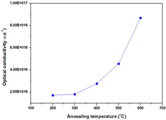 Figure 11 displays the variations in optical conductivity for CeO2 thin films with different annealing temperatures. As observed from the figure, there is an enhancement in optical conductivity with increasing annealing temperatures. This variation in optical conductivity makes these films good candidates for many applications, such as nanophotonic systems, optical coatings, and optical devices.