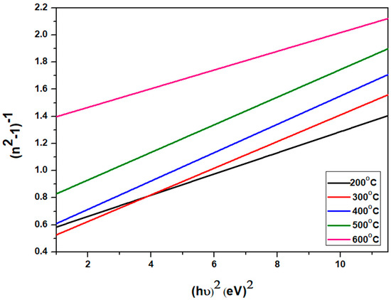 Figure 12 illustrates the (n2 − 1)−1 plots against (h)2, where linear regression was used to determine the values of E0 and Ed from the intercept and the slope, (E0Ed)−1. The obtained values of E0 and Ed are listed in Table 2. The oscillator energy E0 increases with increasing annealing temperature, as suggested by the WDD model (E0 ≈ 0.7Eg). This increment may be attributed to the decrease in the energy gap. Conversely, the dispersion energy Ed values decrease when increasing the annealing temperature from 200 to 600 .