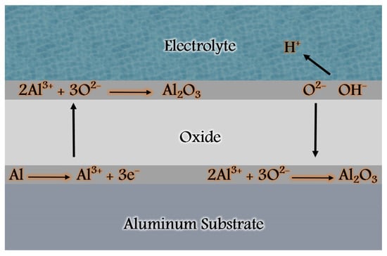- In the presence of a strong electric field, aluminum cations undergo migration toward the cathode, while anions present in the aqueous solution (such as O2−, OH−, and electrolyte anions) move in the opposite direction. At the interfaces of the metal/oxide and oxide/electrolyte, the Al3+ cations react with the anions, giving rise to the formation of aluminum oxide (Al2O3).2Al3+ + 3O2− = Al2O3 (at the metal/oxide interface)2Al3+ + 3H2O = Al2O3 + 6H+ (at the oxide/electrolyte interface)