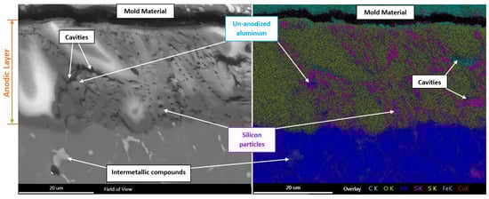 - Formation of un-anodized regions: Un-anodized regions form when the oxide layer does not completely surround the Si phase, potentially due to its morphology or reduced particle spacing. As a result, the eutectic silicon phase functions as a barrier, protecting the nearby Al matrix from the oxide layer and thereby preserving it in an un-anodized state. Residual metallic Al phases are primarily observed under or among large, interconnected Si eutectic particles [39,40].