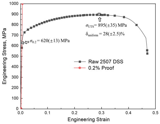 Engineering stress–strain curve of the hot-rolled S32750 DSS wire without cold drawing.
