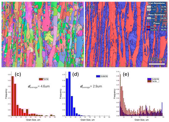 EBSD characterizations obtained from the longitudinal section of hot-rolled S32750 DSS wire without cold drawing. (a) EBSD-IPFx map shows the ferrite and austenite; (b) EBSD phase map; (c) Grain-size distribution of ferrite phase in (a); (d) Grain size distribution of austenite phase in (a); and (e) Grain size distribution of dual phases in (a).