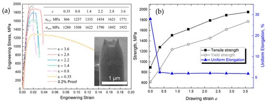 (a) Engineering stress–strain curves of the hot-rolled S32750 DSS wire at different cold drawing strains (the inset shows the values of yield strength σ0.2 and ultimate tensile strength σUTS and the fracture of the wire at ε = 3.6). (b) The ultimate tensile strength and uniform elongation versus drawing strain.