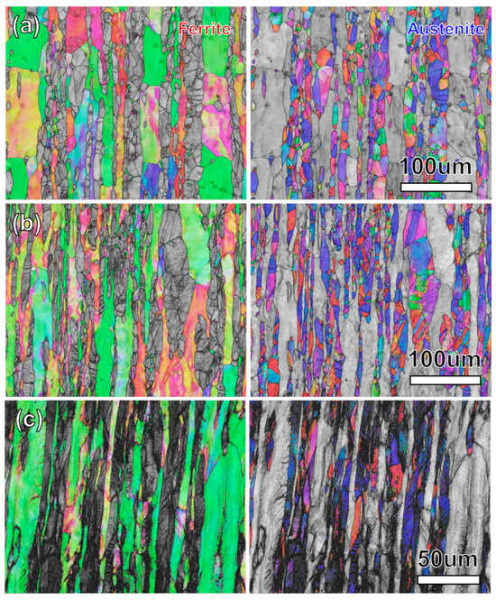 Electron backscattered (EBSD) maps of S32750 DSS wires at different drawing strains. (a) ε = 0.35; (b) ε = 0.8; and (c) ε = 1.4.