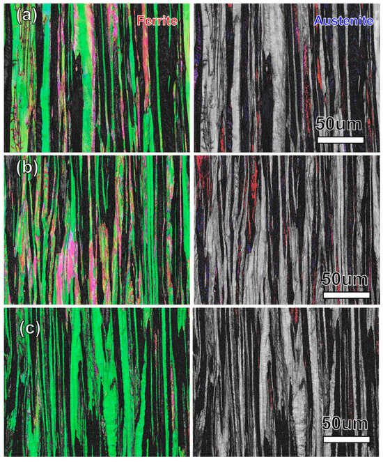 Figure 6a–c exhibits the EBSD maps of S32750 DSS wires at different drawing strains (ε = 2.2, 2.8 and 3.6). It can be seen that with the increase in drawing strain, the austenite is almost unable to be identified by the EBSD. The orientation of retained austenite grains is red, indicating a typical <100> texture feature. The texture feature is the direction of non-twinning deformation, and the part of austenite that cannot be identified by EBSD has been completely transformed into nanograins (black area). This microstructural characteristic indicates that the austenite undergoes twinning deformation, which induces a rapid grain refinement. Meanwhile, the austenite in S32750 is in a metastable phase; the austenite may also undergo deformation-induced martensitic transformation []. After a large deformation drawing, the ferrite phase is further refined into a fibrous structure, and there is also a sub-grain structure inside a ferrite fiber. At a strain of 3.6, the orientation color of the ferrite phase is almost completely green, indicating that it forms a single and strong <110> fiber texture.