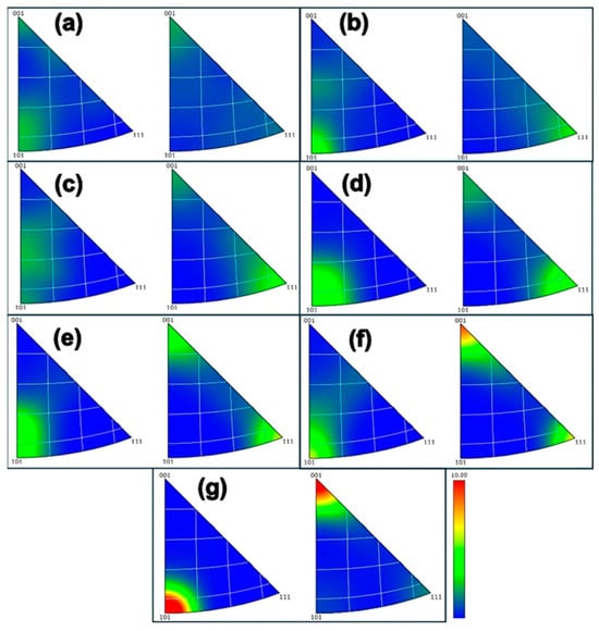 Electron backscattered (EBSD) inverse pole figure (IPF) maps of S32750 DSS wires at different drawing strains. (a) ε = 0; (b) ε = 0.35 (c) ε = 0.8; (d) ε = 1.4; (e) ε = 2.2; (f) ε = 2.8; and (g) ε = 3.6.