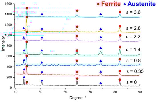 X-ray diffraction patterns of ferrite and austenite in S32750 DSS wires at different strains.