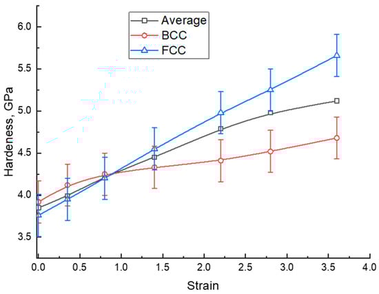 Figure 9 exhibits the nanoindentation hardness of austenite and ferrite phases versus the drawing strains. It is generally believed that the austenite phase is the softer one when it is compared with the ferrite phase. As can be seen from Figure 9, the austenite in the drawn S32750 DSS wires exhibits a high hardening rate. When the drawing strain reached 0.8, the hardness of the austenite phase exceeded that of the ferrite. This result is mainly attributed to the twinning deformation mechanism of the austenite during the drawing, which hardens the austenite rapidly. The strengthened austenite phase was further strained in the next step—martensitic transformation—and the original austenite grains were replaced by nanoscale martensite grains []. The strain-induced martensite in the austenite should contribute to the hardness improvement continuously, since the EBSD and XRD result have revealed the strain-induced martensitic transition keeps occurring as the drawing strain increases. In addition, the continuous strain hardening ability of the ferrite phase with high initial hardness is insufficient [].