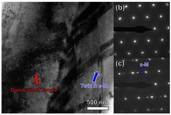 Bright-field TEM images showing the dislocation and band-like structures of S32750 DSS wires at a strain of 0.8. (a) TEM bright field images; (b) selected area electron diffraction (SAED) of ferrite phase; and (c) SAED corresponding to twins and ε-martensite in the austenite phase.