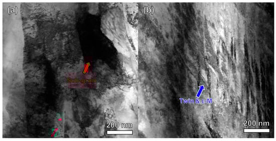 Bright-field TEM images of S32750 DSS wires at a strain of 1.75. (a) shows sub-grains and (b) shows twin and ε-martensite.