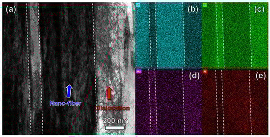 Bright-field TEM images of S32750 DSS wires at a strain of 3.6. (a) shows nano-lamellar structure and (b) the corresponding EDS mapping of Ni, (c) the corresponding EDS mapping of Cr, (d) the corresponding EDS mapping of Mo, (e) the corresponding EDS mapping of N.