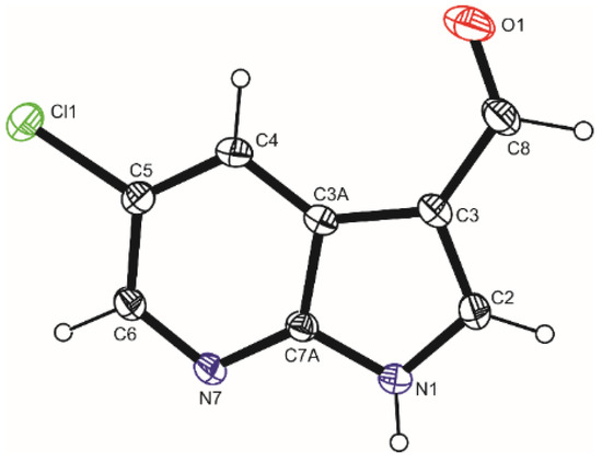 X-ray analysis reveals that the six-membered pyridine and five-membered pyrrole rings forming the skeleton of the 7-azaindole moiety are coplanar. For example, the torsion angle C3–C3A–C7A–N7 measures −179.98(8)°, and the N1–C2–C3–C3A torsion angle approaches zero (0.36(11)°). Moreover, the carbaldehyde group of 5Cl7AICA is nearly coplanar with the five-membered ring, as evidenced by the torsion angles O1–C8–C3–C3A and O1–C8–C3–C2 measuring 0.74(19)° and −179.18(14)°, respectively (Figure 1). Torsional angle Cl1–C5–C6–C3A measuring −179.86(13)° indicates that the chlorine atom lies on the molecular plane of 5Cl7AICA.