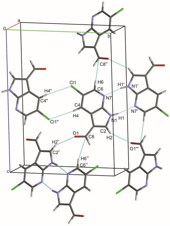 Selected bond lengths and bond angles in 5Cl7AICA are provided in Table S2 in the Supplementary Material. The chlorine atom at the fifth position does not significantly affect the bond lengths within the ring, in comparison to unsubstituted 7AICA [17]. The C5-Cl1 bond length, 1.7324(11) Å, in 5Cl7AICA is similar to those observed in other derivatives of 7-azaindole, ranging from 1.7217(17) Å to 1.745(5) Å [44,45,46]. Most bond angles in 5Cl7AICA closely resemble those in 7AICA, differing by less than 1°. Only two bond angles, C3A–C4–C5 and C4–C5–C6, exhibit slightly larger values in 5Cl7AICA compared to 7AICA [17], likely due to the presence of the chlorine atom at the fifth position.