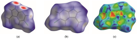 Figure 3a,b depicts the molecular Hirshfeld surfaces mapped with dnorm [48] for 5Cl7AICA. The prominent red spot near hydrogen atom H1 represents the donor involved in the dominant N1–H1⋅⋅⋅N7 hydrogen bond, while another significant red spot near nitrogen atom N7 signifies the acceptor atom in this hydrogen bond. Additionally, small red dots near hydrogen atom H6, oxygen atom O1, and chlorine atom Cl1 indicate the donors and acceptors of weak C6–H6⋅⋅⋅C8, C2–H2⋅⋅⋅O1, and C4–H4⋅⋅⋅Cl1 hydrogen bonds, with spot size and color reflecting the interaction strength. The presence of π⋅⋅⋅π interactions between the 7-azaindole rings is evidenced by the red and blue triangles on the shape index surface of 5Cl7AICA in Figure 3c. The distance between the Cg1 centroid of the six-membered ring and its symmetry-related counterpart is 2.83 Å in 5Cl7AICA, indicating a π⋅⋅⋅π interaction, as shown in Figure S1 and Table S3 of the Supplementary Material. According to the literature, a distance of approximately 3.8 Å is generally regarded as the upper limit for π⋅⋅⋅π interactions to be considered significant [49].