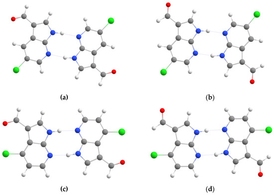 The computational models employed in calculations: (a) Dimer 1 of 5Cl7AICA constructed from two trans conformers; (b) Dimer 2 of 5Cl7AICA constructed from two cis conformers; (c) Dimer 1 of 4Cl7AICA constructed from two trans conformers; (d) Dimer 2 of 4Cl7AICA constructed from two cis conformers. The terms trans and cis refer to the relative orientation of the C8=O1 (carbonyl) and C3=C2 (pyrrole) bonds along the exocyclic C3–C8 bond (see Figure 1 for the numbering of atoms). Legend of colors: red—oxygen, blue—nitrogen, green—chlorine, dark gray—carbon, light gray—hydrogen atoms.