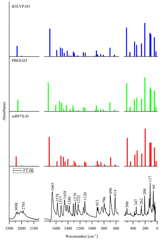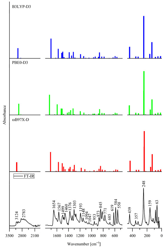Comparison of the experimental IR spectrum of 4Cl7AICA in the range 3800–50 cm−1 with the corresponding theoretical spectra calculated for dimer 2 of 4Cl7AICA using three DFT methods. Theoretical wavenumbers are scaled, as shown in Section 2.4.