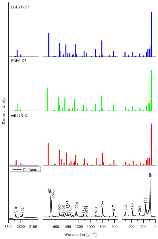 Comparison of the experimental Raman spectrum of 4Cl7AICA in the range 3800–50 cm−1 with the corresponding theoretical spectra calculated for dimer 2 of 4Cl7AICA using three DFT methods. Theoretical wavenumbers are scaled, as shown in Section 2.4.