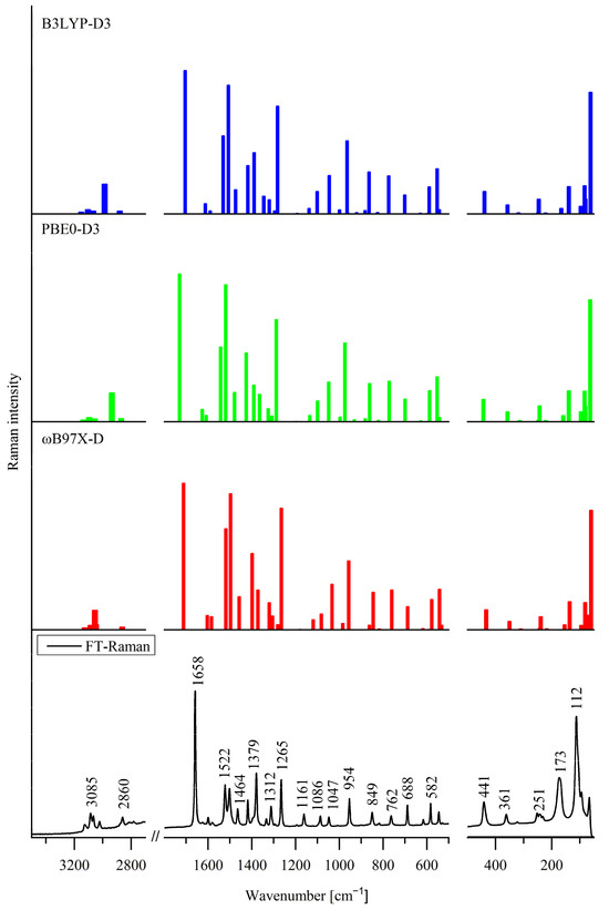 The harmonic frequencies, infrared intensities, and Raman scattering activities were computed for the optimized structures. The theoretical Raman intensities were calculated using the Chemcraft program [41]. The B3LYP-D3-calculated frequencies were scaled by 0.961 in the range ≥ 2000 cm−1, by 0.979 in the range from 2000 to 1000 cm−1, and left unscaled in the range < 1000 cm−1. The PBE0-D3-calculated frequencies were scaled by 0.951 in the range ≥ 2000 cm−1, by 0.970 in the range from 2000 to 1000 cm−1, and by 0.990 in the range < 1000 cm−1. The ωB97X-D-calculated frequencies were scaled using three scale factors: 0.948 for frequencies ≥ 2000 cm−1, 0.953 for frequencies in the range from 2000 to 1000 cm−1, and 0.970 for frequencies < 1000 cm−1, following the recommendations in Ref. [42]. Additionally, potential energy distributions (PEDs) were determined using the FCART program (version 7.0) [43] to aid in the assignment of the vibrational spectra. Furthermore, the Chemcraft program [41] was employed for the graphical visualization of the normal modes.