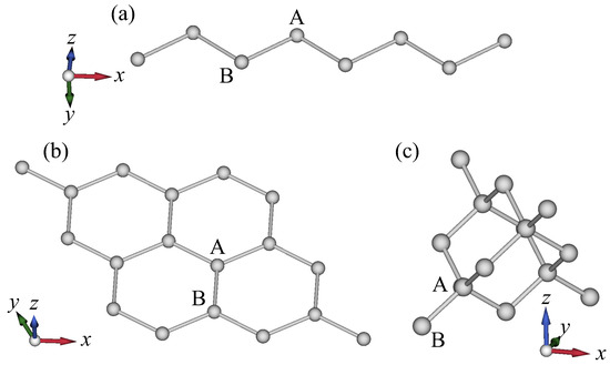 Locally noncentrosymmetric crystal structures consisting of two sublattices A and B, (a) the one-dimensional zigzag chain, (b) the two-dimensional honeycomb structure, and (c) the three-dimensional diamond structure. In each case, the odd-parity multipoles are induced when the staggered electronic orderings occur.