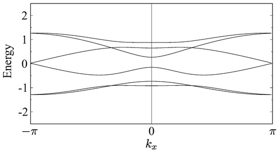 In this section, we discuss the effect of the staggered orbital ordering in the one-dimensional zigzag-chain model in Equation (8). Since the staggered orbital ordering breaks the spatial inversion symmetry, the ASOC emerges, where the functional form is expected from the symmetry argument in Table 1. For reference, we show the band structure without the mean-field term in Figure 3; there are six bands and each band is doubly degenerate owing to the presence of both the spatial inversion and time-reversal symmetries.