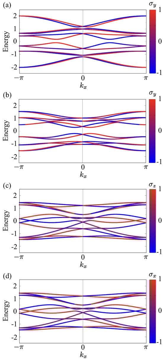 The electronic band structure in the one-dimensional zigzag chain under the staggered orbital orderings with (a) , (b) , (c) , and (d) at . The contour represents (a,b) the y-spin polarization, (c) the z-spin polarization, and (d) the x-spin polarization at each wave vector.