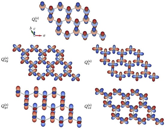 We consider the relationship between the staggered orbital ordering and odd-parity multipole in the two-dimensional honeycomb structure [41,107,108,109,110,111,112]. We suppose the site under the space group . Similarly to the zigzag-chain case, the staggered orbital ordering leads to the odd-parity multipoles and the ASOCs. For the orderings, as shown in Figure 5, are induced, where represents the electric octupole. Meanwhile, no chiral-type ASOC that originates from appears in the honeycomb structure. The correspondence among the staggered orbital ordering, odd-parity multipole, and ASOC is shown in Table 2.