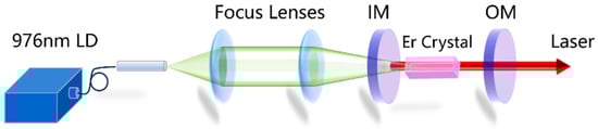 The laser experiments were carried out with a linear plano-concave resonator as depicted in Figure 2. A fiber-coupled 976 nm LD was used as pump source. The core diameter of the fiber was 105 μm with a numerical aperture (NA) = 0.22. The pump beam was collimated and focused by a couple of convex lenses with the expansion ratio of 1:2. The input mirror (IM) was a concave lens with curvature radius of −50 mm and coated with high transmittance (HT) for the pump beam and high reflectivity (HR) at 2.7~2.95 μm. A series of plane lenses with different transmittance of 1%, 2%, and 3% for laser beam were utilized as the output mirror (OM). The laser beam was reflected to the power meter by a dichroic mirror with HR for the laser beam and HT for the pump beam so the laser output power could be measured.