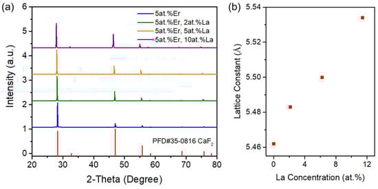 (a) PXRD patterns of the crystals, (b) plot of lattice constant versus La concentration for Er,La:CaF2 crystals.
