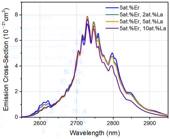 The emission cross-sections (σem) near 2.8 μm were calculated according to the Judd–Ofelt theory and the Füchtbauer-Ladenburg formula [28], and are illustrated in Figure 6. The σem at 2729 nm also shows a rise for 2 at.% La3+ co-doped sample (from 7.3 × 10−21 cm2 to 7.8 × 10−21 cm2), then a decline with La3+ concentration increasing. The broad emission band in the long wavelength range overall decreased, which results in the width of this emission band narrowing.