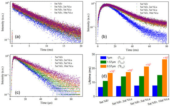 The measured fluorescence decay curves monitored at around (a) 1 μm (4I11/2), (b) 1.57 μm (4I13/2), and (c) 0.57 μm (4S3/2), and (d) the summary of the fitted lifetimes.