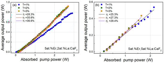 Output power of 2.8 μm versus absorbed pump power at 976 nm for (a) 5 at.% Er, 2at.% La:CaF2 and (b) 5 at.% Er, 5 at.% La:CaF2.