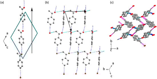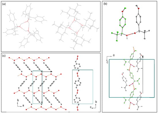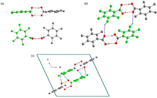 It is noteworthy that among different benzoic acid derivatives, all of which form dimers, there are different possibilities of expanding a 0-D network into higher dimensional networks. Dimers of 2,3,4,5,6-pentamethyl benzoic acid (TUSQIH, [30]) can be seen in Figure 3. The angles formed by the plane of the carboxyl group (χ) with the plane of the ring (φ) in the two independent molecules are 87.9 and 89.1°. These dimers develop into tetramers (Figure 3b), which further expand via weaker hydrogen bonds, the C-H…O type bonds, to form a chain along [0 1 0] (Figure 3c). The existence of this type of hydrogen bond was first acknowledged by Sutor [31] in 1962. Since then, a lot of information regarding these types of interactions has been gained in terms of their lengths, angles formed, as well as techniques used to investigate such bonds [32,33,34,35,36]. In the case of molecules of compounds that do not contain O-H groups, i.e., ketones, only C-H…O bonds can lead to the formation of hydrogen-bonded networks.