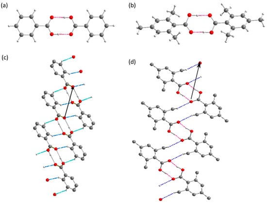 Although in crystallography, point groups are commonly applied to define the crystal class, point groups serve well to indicate the symmetrical relations of the repeating units in discrete oligomers. As such, point groups can be used to describe the symmetry of hydrogen bonds of organic molecules such as monocarboxylic acids [26,27]. The symmetry relations and the number of molecules in an oligomer depend on the geometry of the molecules, which impact their ability to develop into higher order networks, and as a consequence, their reactivity. The simplest assembly of molecules is a dimer, which is easily formed by organic acids, in which one oxygen atom of the carboxylic group acts as a hydrogen donor and the other as an acceptor. Several derivatives of benzoic acid can be found in the Cambridge Structural Database (CSD) [28]. The REFCODE, i.e., unique symbol consisting of six letters and optionally a number under which a given compound is listed in the CSD, is provided in the text. Figure 2a,b depict the O-H…O dimers formed by molecules of benzoic acid (BENZAC01, [26]) and 2,4,6-trimethylbenzoic acid (TMBZAC02, [29]), respectively. In the unsubstituted molecule, the angle formed by the plane of the carboxyl group (χ) with the plane of the ring (φ) is only 1.5°. In contrast, in the case of 2,4,6-trimethylbenzoic acid, this angle is 42.7°. Despite this difference in the geometry of the dimer, both types of dimers form weaker hydrogen bonds, i.e., C-H…O ones, to form 1-D networks with the p rod group symmetry (Figure 2c,d). The chains run in direction [1 1 0] and [0 1 0] with a translation vector of 7.55 Å and 7.04 Å, respectively.