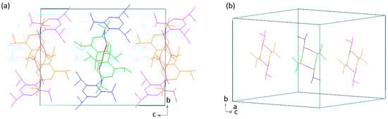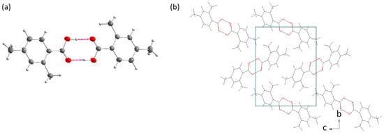 The development of a 0-D network into higher dimensions via hydrogen bonding can also be hindered by the geometry of the molecule itself. For example, the molecules of 2,4-dimethylbenzoic acid (synthesized by us earlier and described in [27]) are not flat. The plane of the aromatic ring and the plane of the carboxyl group form an angle of 14.1°. As a result, dimers of these molecules (Figure 4a) do not form rod groups nor combine into larger clusters. Their arrangement in the unit cell is depicted in Figure 4b. This shows that both the number of the substituents and the geometry of the molecule itself determine the options of development of dimers into larger hydrogen-bonded networks.