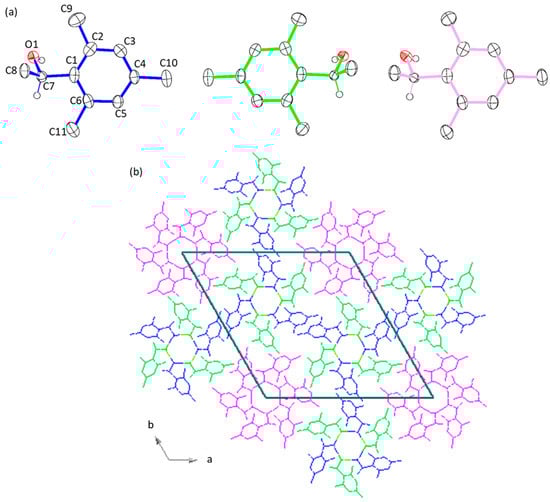 Images of (a) three independent molecules of 1-(2,4,6-trimethylphenyl)ethanol and (b) the arrangement of hexamers in the unit cell.